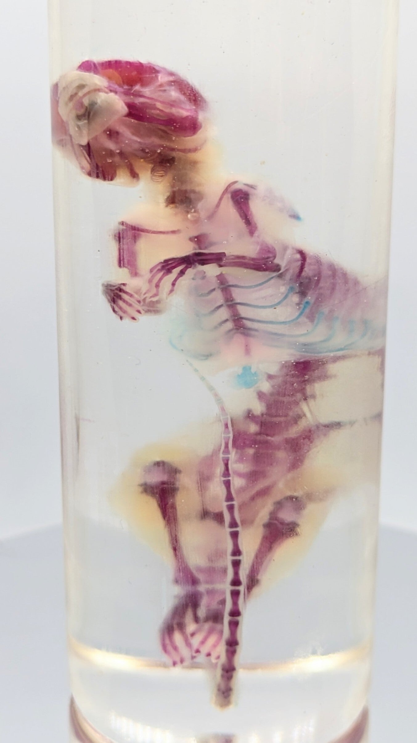 Cette chimère à tête de perruche sur corps de souris repose dans une fiole de 12cm.
