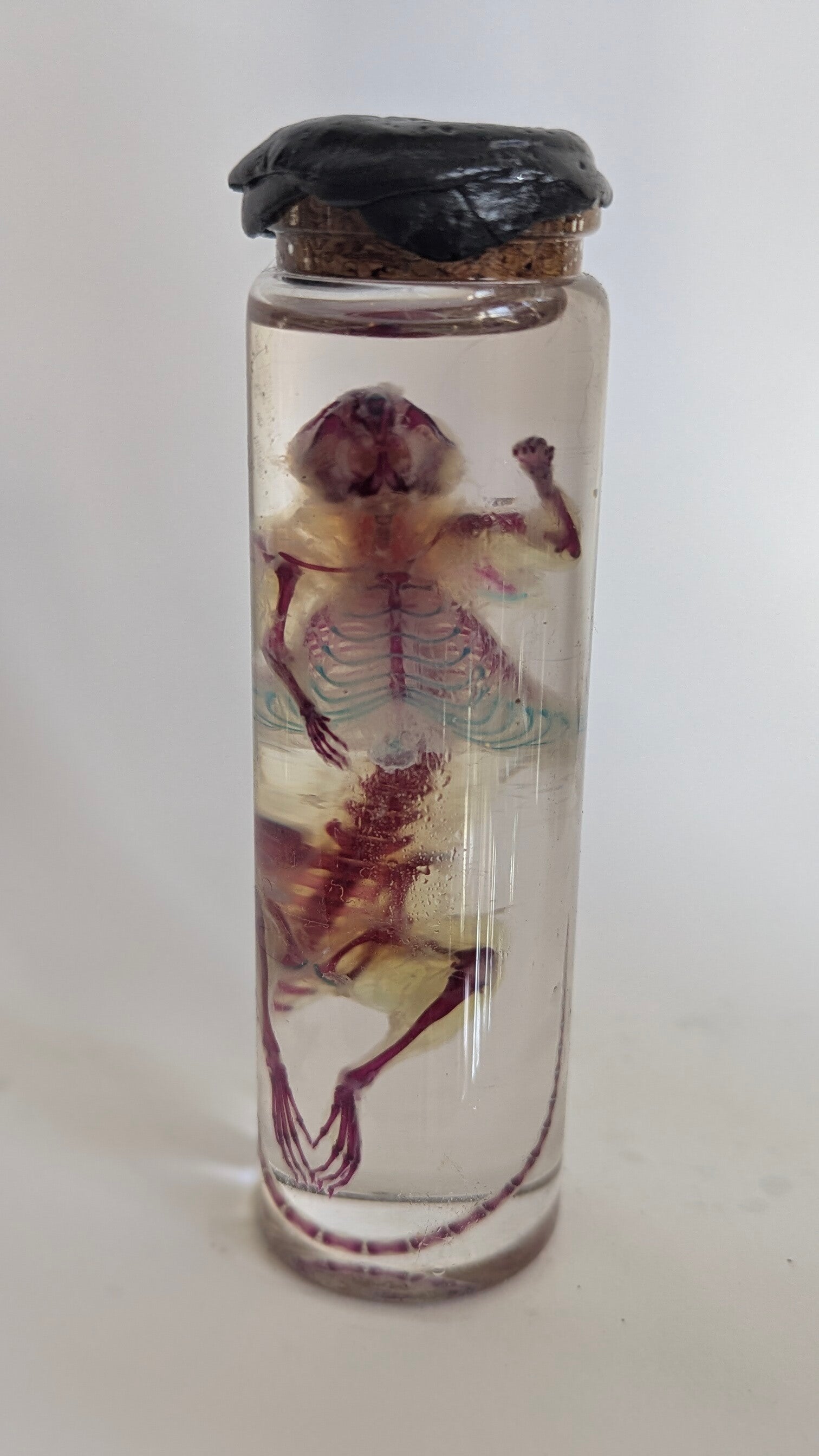 Souris diaphanisée dans fiole tube de 10cm de haut.